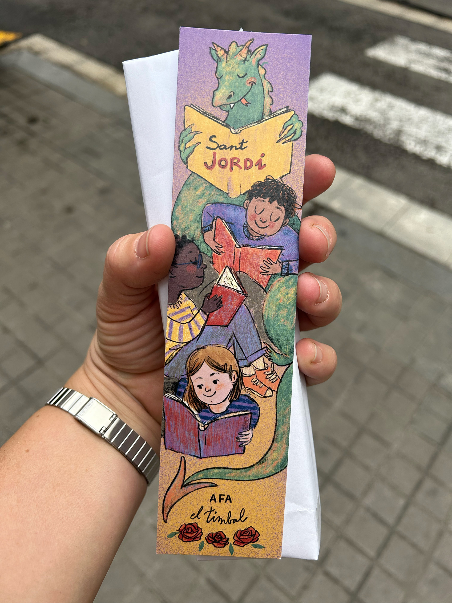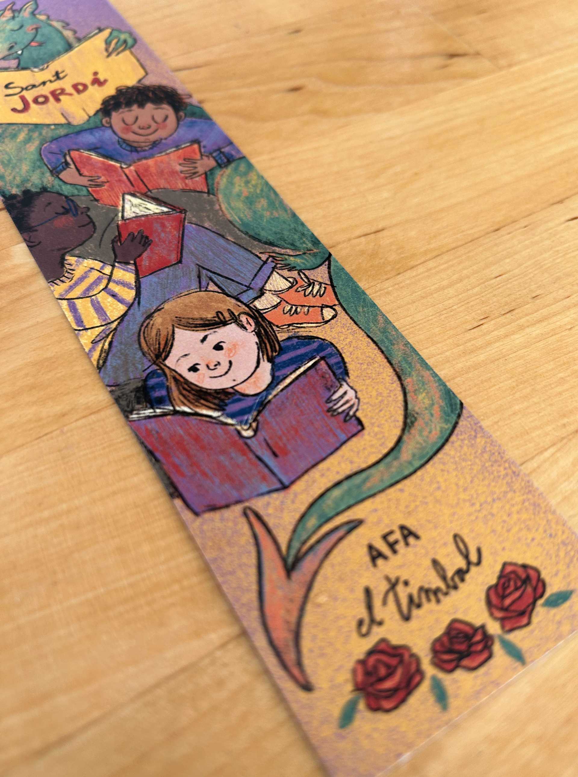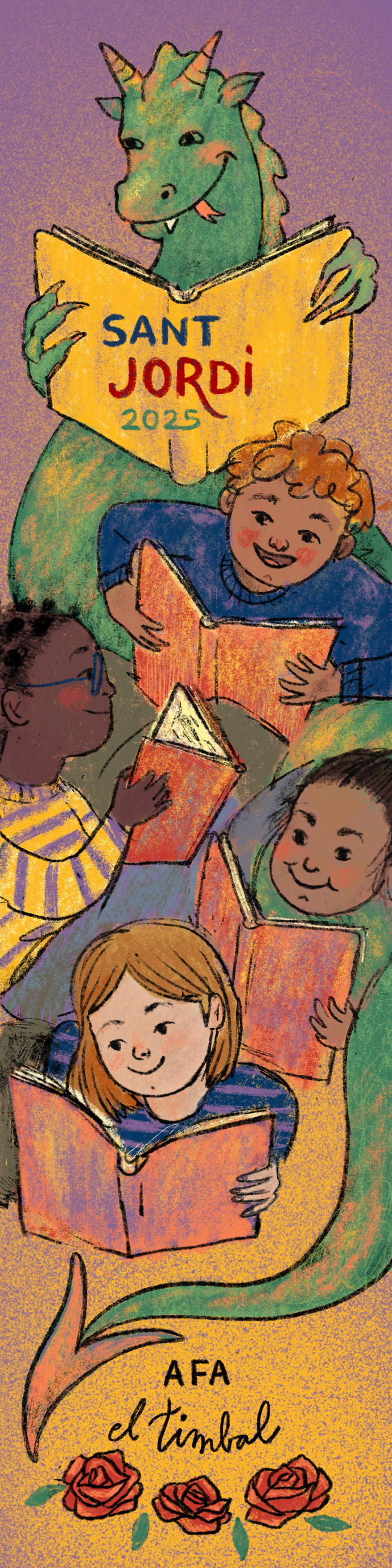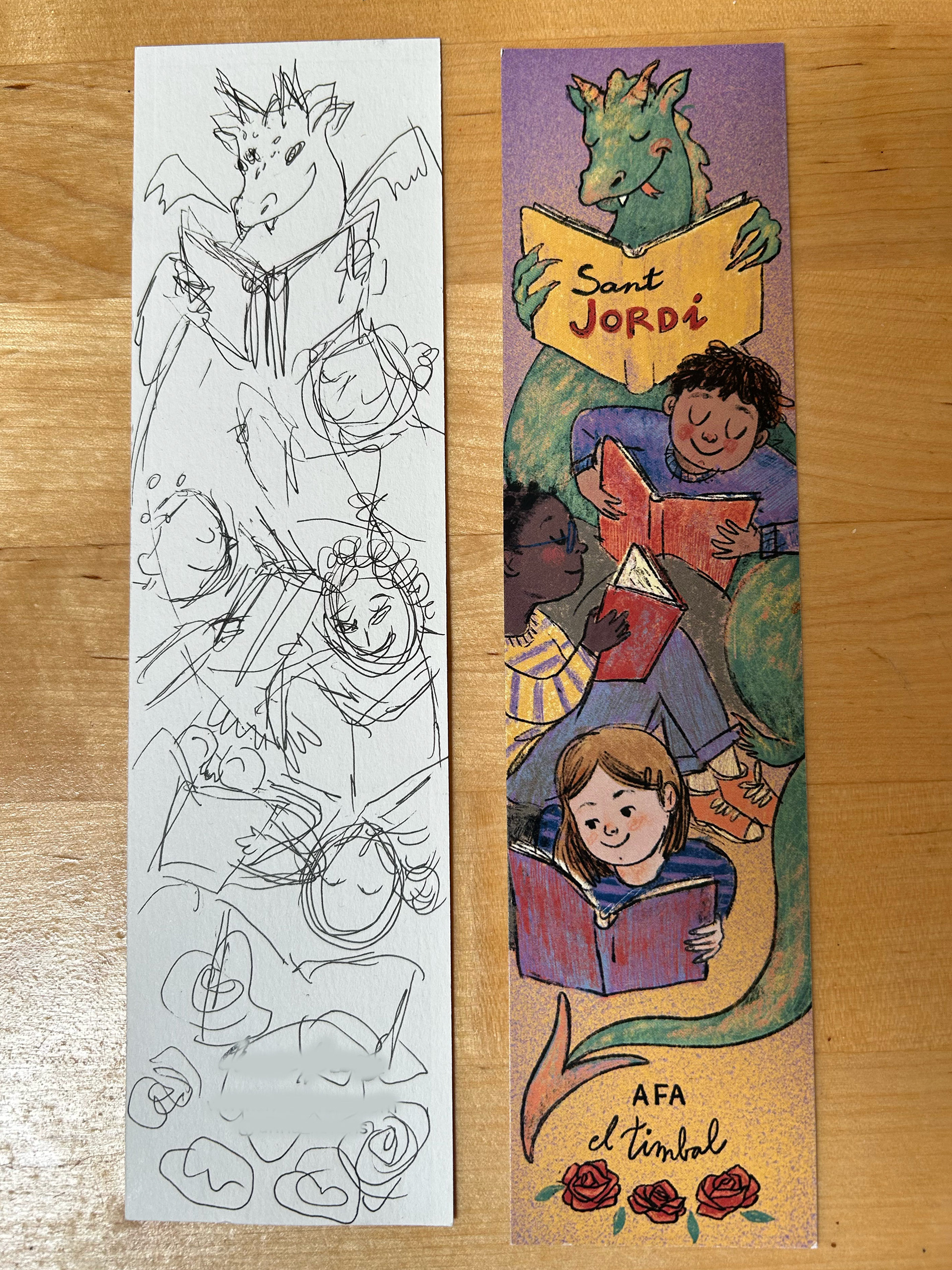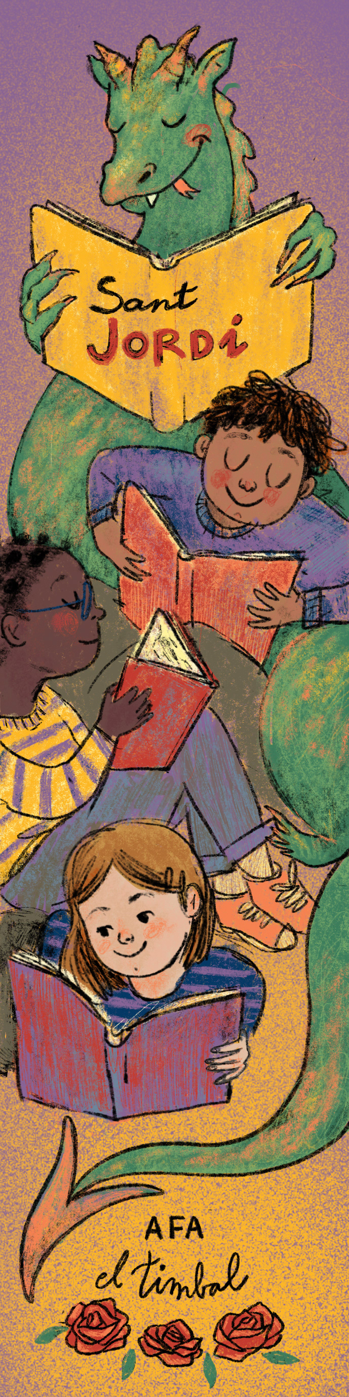 Ilustración basada en la leyenda de Sant Jordi para ilustrar el punto de libro que se regala en la celebración del día del libro en la escuela infantil el Timbal.